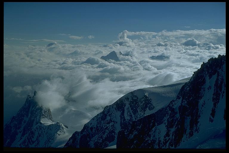 Looking down on the Aiguille du midi (left) from the Gouter ridge (just below the dome du Gouter).