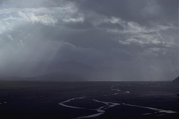 Looking up the Waimakariri towards Klondyke Corner. This is a typical East Coast braided river. Long trudges up river beds like this is very much a part of NZ climbing. The highest Peaks in Arthur's Pass lie on the Shaler Range and involve a 10-15km boulder-bash up the Waimak. Its not too bad (the Rangitata and Rakaia are far longer) - fast people get to Carrington Hut, on the way to Mt Murchison (2400m) in 2hrs, most trampers take 3-4 hours. But it can seem longer! Still it has to be done... and often on a Friday night or early Saturday morning before the sun is up. Although the river bed is up to 2km wide, the channels are usually not very wide and only knee deep. However, after as little as 12 hours of Norwest rain, the river can rise rapidly and it can even get bank to bank across the valley - an impressive sight. East Coast river flow rates can vary between 40 and 4000 cumecs! (The jet boat was invented in NZ to allow farmers to get up the braided sections of East Coast rivers where the channels might only be a few inches deep).