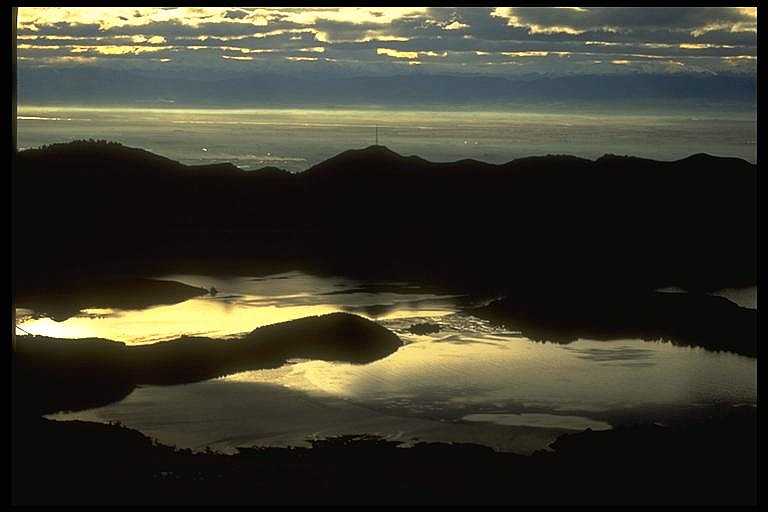 | Sunset from near the summit of Mt Herbert. Looking across the Port Hills to Christchurch, the Canterbury Plains then Mt Oxford and the foothills of the Alps. |