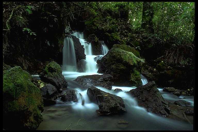 | Victoria falls on the track up to Ketetahi hot springs. The stream gushes down through the forest. The water looks inviting but is contaminated by toxic chemicals from the springs above. |